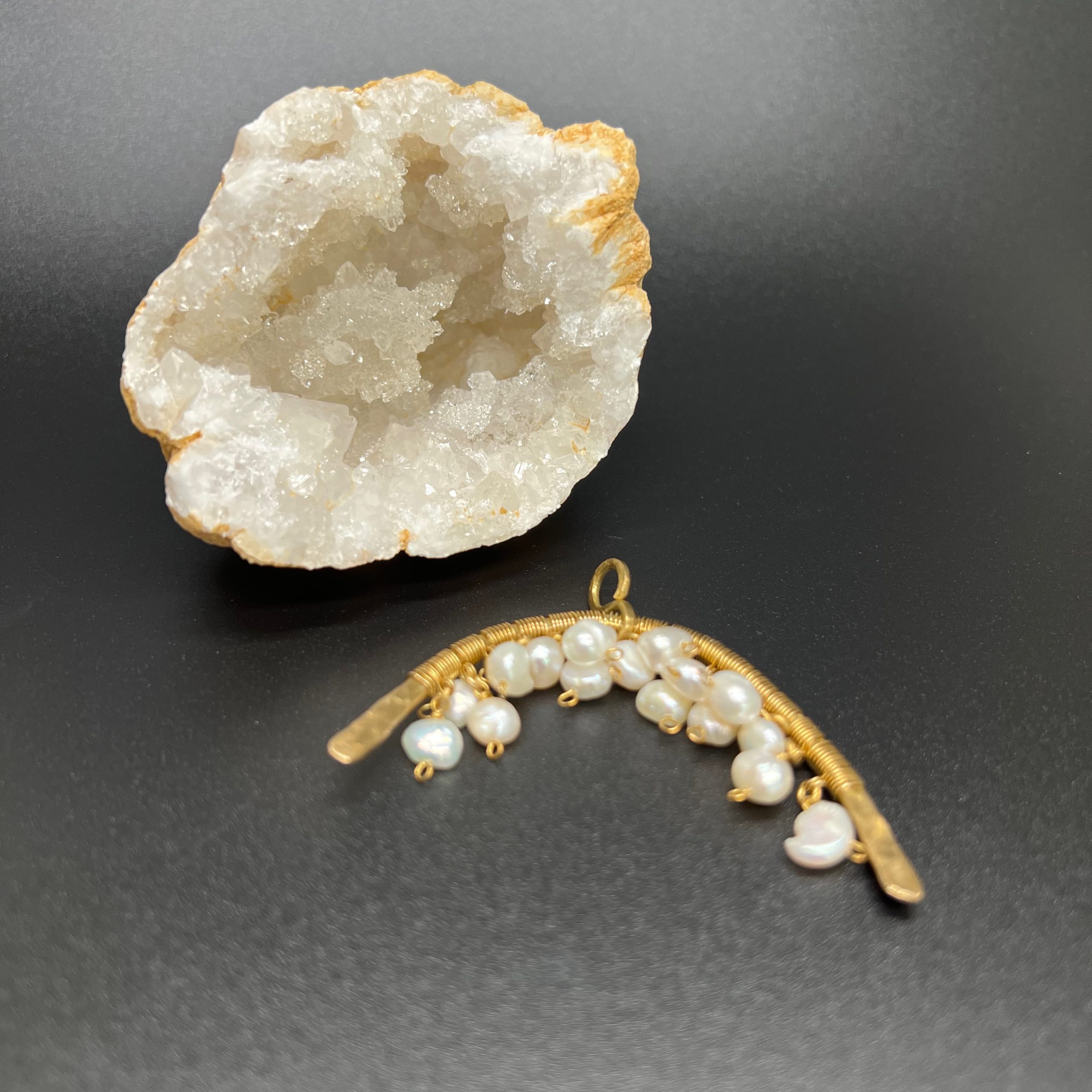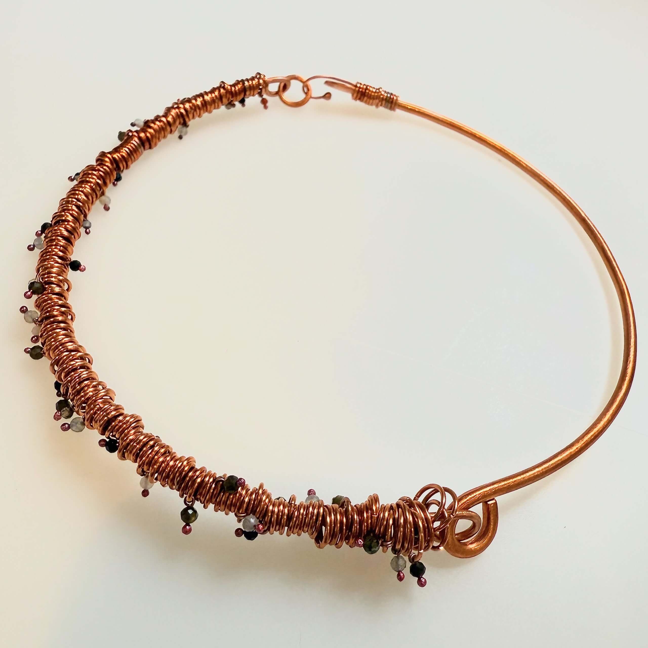 So immediately when I saw the pearls I thought to myself, okay, I can see them embraced and caressed by a slinky copper and brass graduated chain weave! I wanted the metal to continue the 3D flow of the pearls and to carry their colours and play with them. To be fluid, liquid-like in its movement. To never look the same twice.