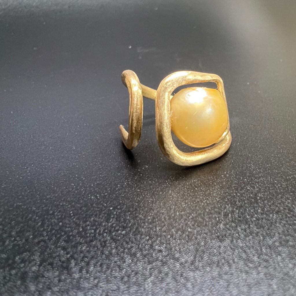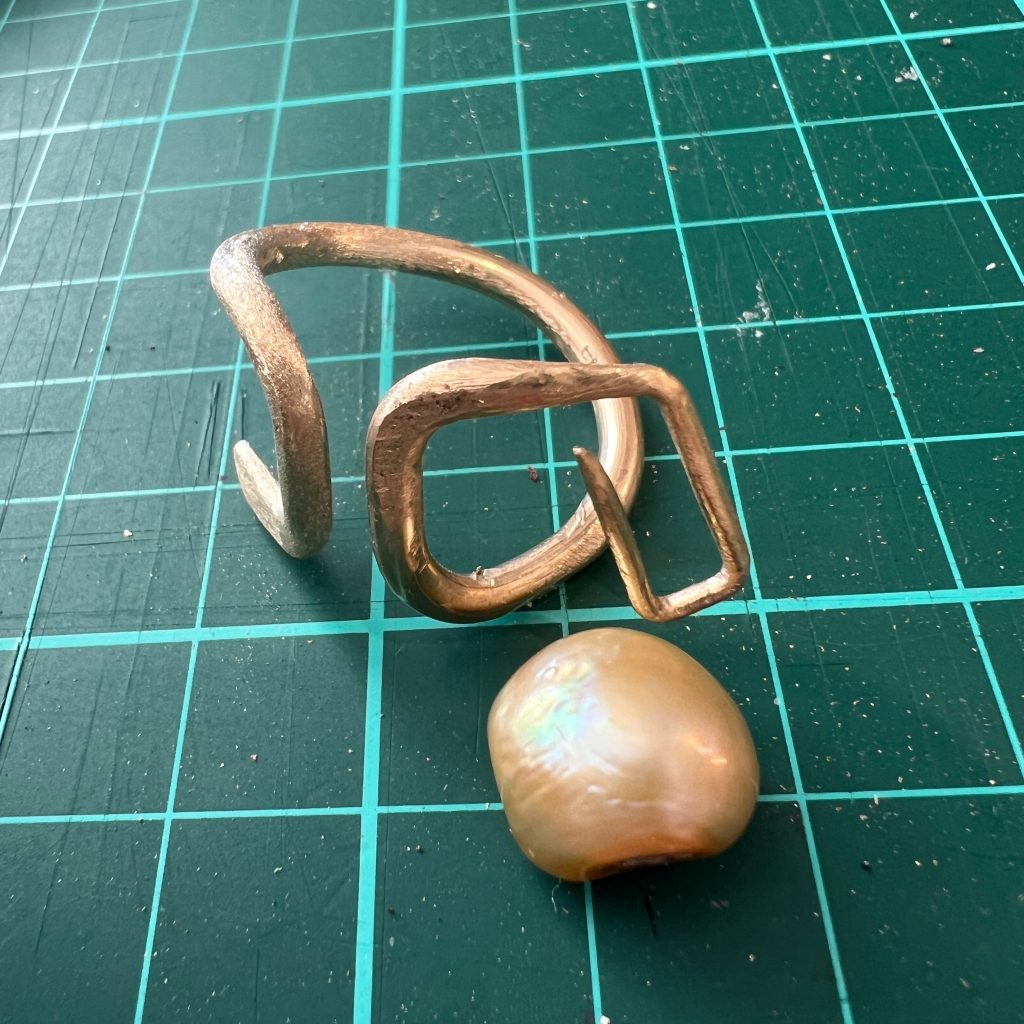 This ring “played nicely” in the shaping stage, which usually doesn’t have to go smoothly. The shape looks simple, but it was very hard to get right, because the pearl is an irregular shape. Which is why I had to make it into a ring!