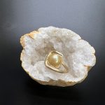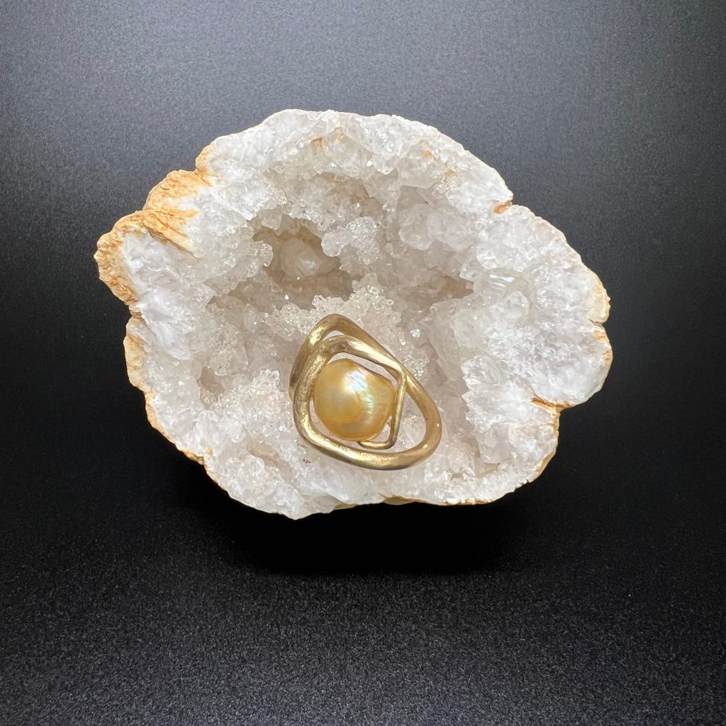 Often my designs “grow” from the stone up. In this case the gem is a freshwater Pearl. Perfectly imperfect, but beautifully bold and enigmatic. You look at this ring and wonder how it stays together! Then you hold it – and you GET exactly why it’s made it into my Strong Collection. This is a solidly confident weight ring. Sculpted from one piece of metal. Brass is a wonderful wild metal to work with. It’s robust and looks gold.