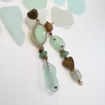 This is a story of green and copper colours… except they come from a mixture of sources. Copper colored moonstones, play off of copper heart vintage charms. Then an odd-shaped frosted green sea glass sing along with a set of cream green Aventurines until your eye rests calmly on the bottom – at the mesmerising moonstone there.
