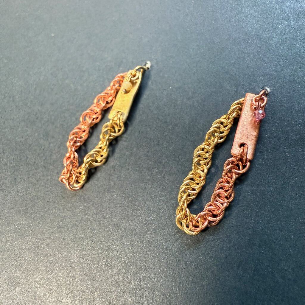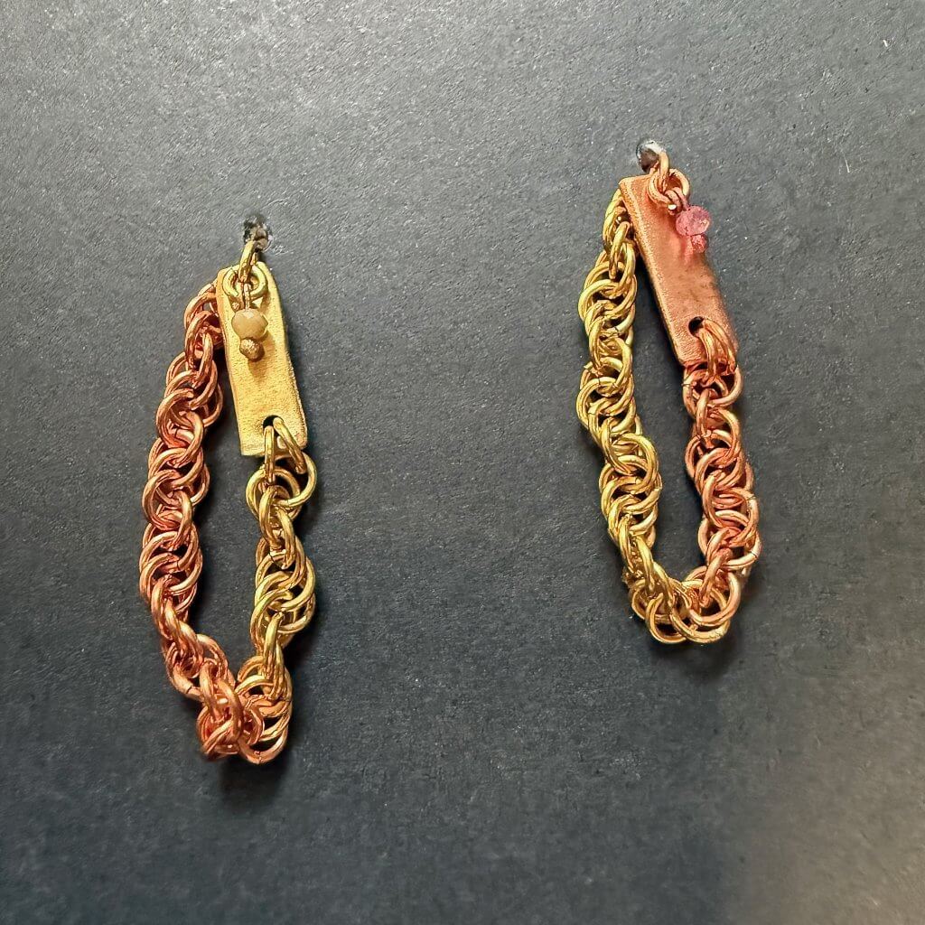 These are perhaps uncharacteristically understated for my typical style, but look closer and you’ll see — they’re still of me ;o) Two-toned chainmaille (copper + brass) relaxes into a firm textured metal line. Until it slinks into chainmail again—because permission to change direction is a self-love language.