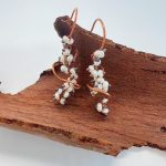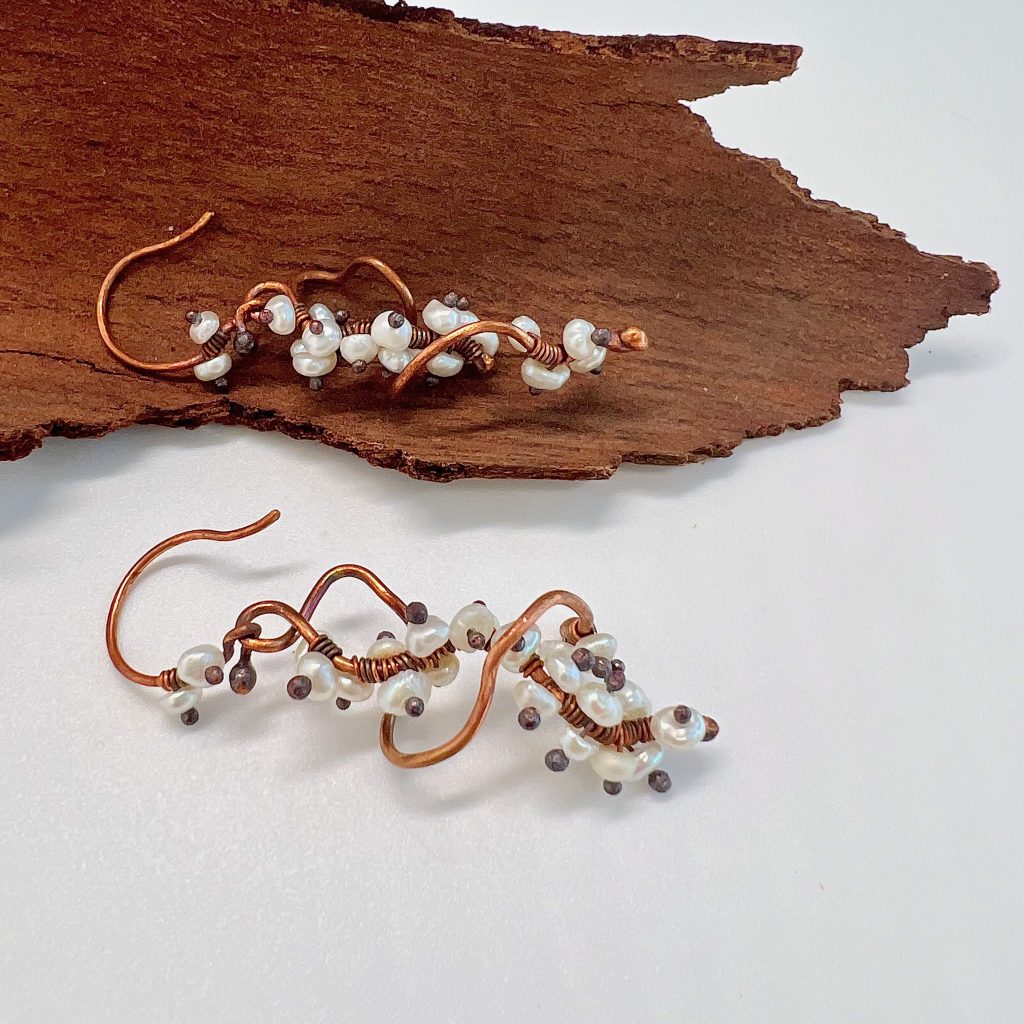 All Treasures | Collections Pearl Bubbles Now £90 Pearl & Copper Freestyle EarringsThese earrings will ask you to hold your space with your style. Not all of us a brave enough to see the beauty of the gentle tiny freshwater Pearls do a party dance with the sturdy darkness of copper.I loved making these earrings – it’s a lot of fiddly work as each pearl is about 2mm in diameter. But the really ‘game’ is in using heat to manipulate the metal ends of each strand while not damaging the delicate pearls!The result is a true opposites-love-each-other story. And I hope if you love them you’d wear them and show them off on the background of a crisp white top (collared shirt, or a T, or a vest would do just as well). With a full length skirt – maybe white, cream or copper colour. Or – you know I’m gonna say this: with jeans :o)However you choose to style them, maybe each time you look at them you remember the effervescence of your free spirit and celebrate that because it’s the spice of life. Enter an amount £ Add to Cart
