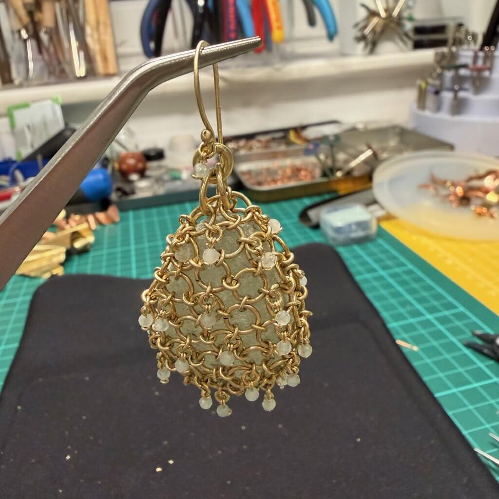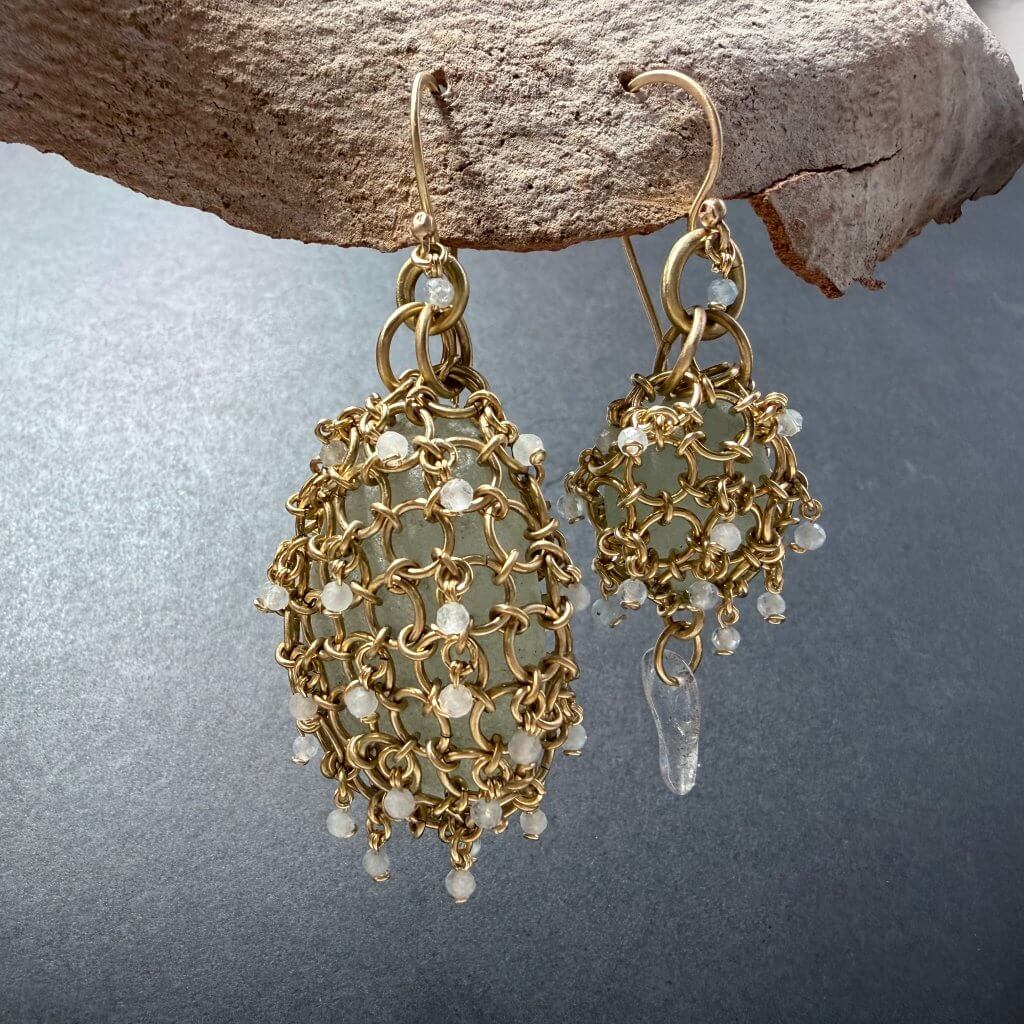 This asymmetric pair is a whole world on its own. Two pieces of sea-glass, shaped by the tides and captured in what looks like rigid cold metal — except it isn’t. The chainmaille shifts and flexes like liquid gold, soft against the skin, a quiet contradiction you can actually feel.